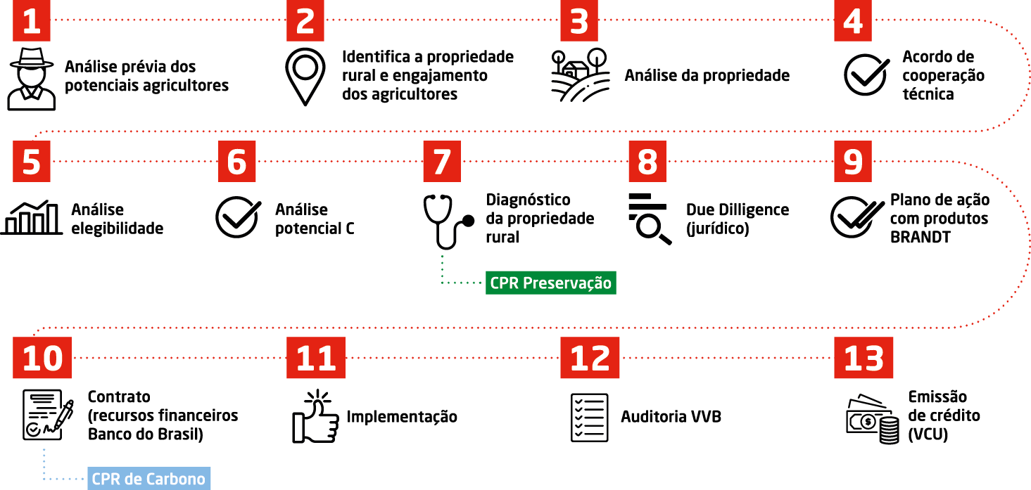 A jornada BRANDT Revitalis começa na identificação e análise da propriedade, passa pela implementação de práticas agrícolas de baixo carbono (plano de ação) e vai até a emissão e venda dos créditos. Confira abaixo o passo a passo: