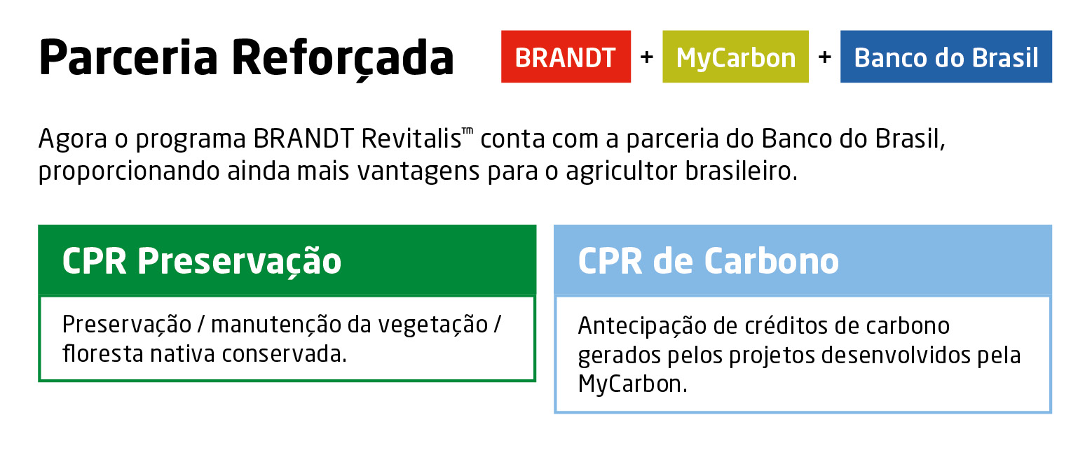 O BRANDT Revitalis é o resultado de uma parceria entre a BRANDT e a MyCarbon. O programa que visa apoiar e facilitar o processo de certificação e comercialização de créditos de carbono gerados através de protocolos da agricultura regenerativa.